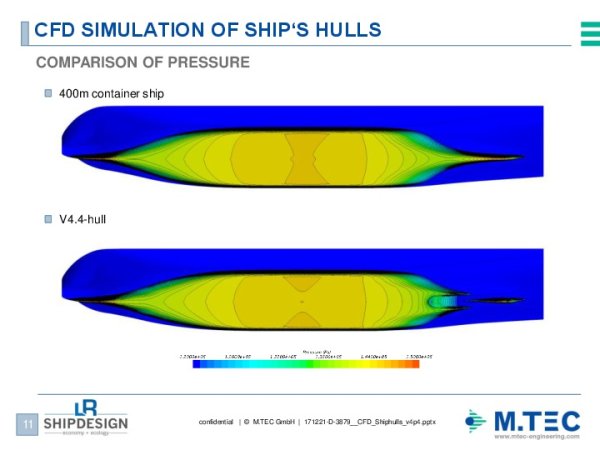 - Bedingt durch die spezielle Formgebung der halbrunden Form am Schiffsboden wird das anliegende Druckvermögen durch die Vertiefung gelenkt und beschleunigt. Dadurch werden die Energieverluste reduziert und das Strömungsbild an den Seitenlinien (hintere Schulter) und Heck optimiert.